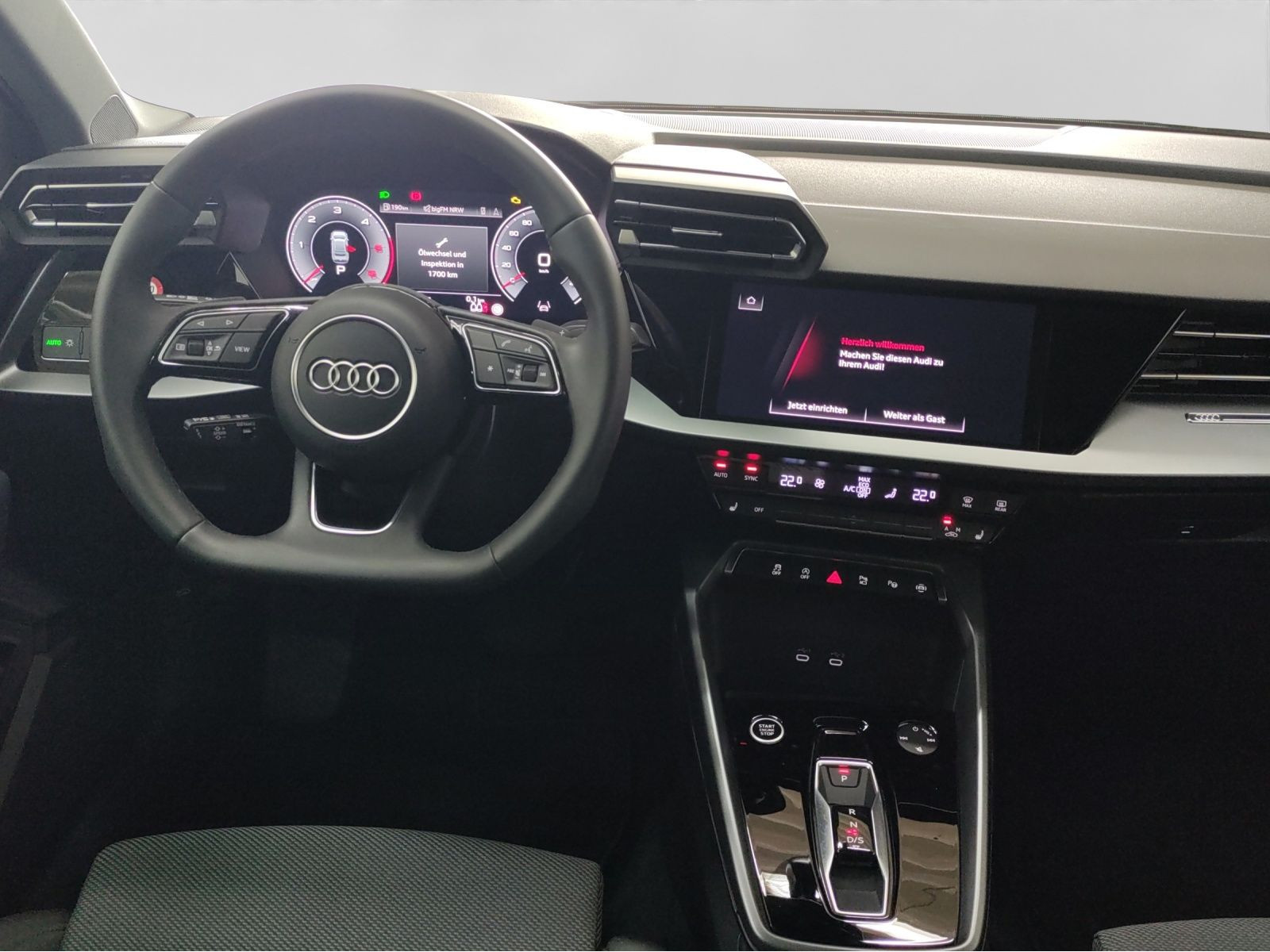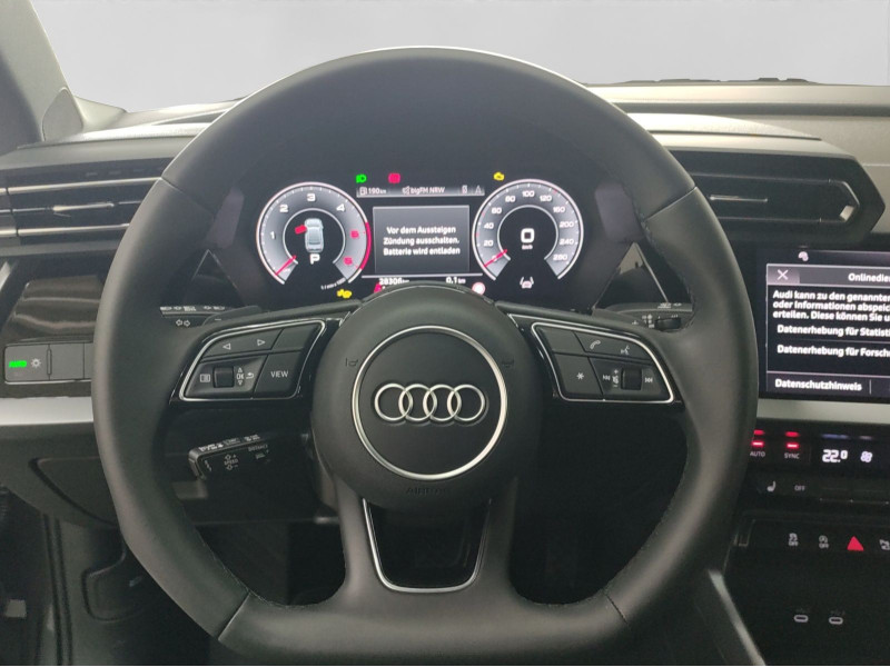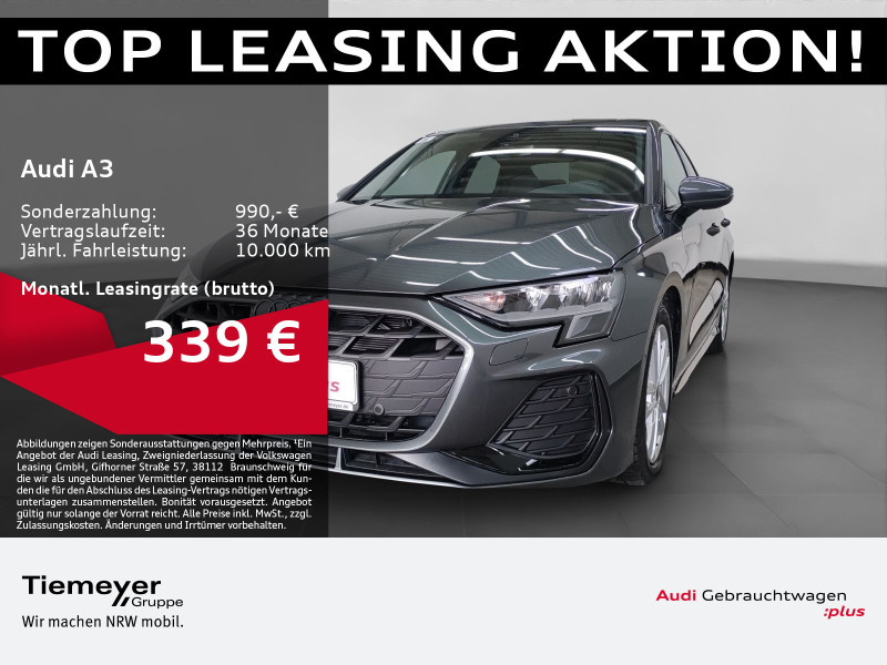 Hersteller-Anschlussgarantie 3 Jahre, max. 100.000 km; **Garantie**; Audi Connect je nach Dienst zeitlich begrenzt; danach kostenpflichtig verlängerbar; Anschlussgarantie 3 Jahre max. 100.000 km; **Getriebe / Antrieb**; Automatik; Frontantrieb; **Pakete**; Ablage-/Gepäckraum Paket; Ambiente Licht Paket; Assistenz Paket Fahren und Parken plus; Business Paket; Connectivity Paket; Klima Paket; Klimatisierungs Paket plus; Komfort Paket II; Komfort Paket plus; Optik Paket Schwarz plus; S line Sport Paket; **Airbags**; Fahrer-/Beifahrerairbag; Interaktionsairbag; Kopfairbag vorn und hinten; Seitenairbag vorn und hinten; **Sicherheit**; Ausweichassistent; Halteassistent; Spurhalteassistent Lane Assist; Spurverlassenswarnung; Tagfahrlicht; Abbiegeassistent; Ablenkungserkennung; Antiblockiersystem ABS; Antischlupfregelung ASR; Audi connect Notruf & Service; Beifahrerairbag Deaktivierung; BRS für Fahrzeuge ohne E-Antrieb (ESC und eBKV); Einparkhilfe vorn und hinten mit Parklenkassistent; Elektrisches Stabilitätsprogramm ESP; Elektronische Bremskraftverteilung EBV; Fernlichtassistent Light Assist; i-Size Kindersitzbefestigung hinten; ISOFIX Kindersitzbefestigung; ISOFIX Kindersitzbefestigung vorn; Kindersicherung elektrisch; Lichtsensor; Motor-Schleppmoment-Regelung MSR; Müdigkeitserkennung; Notbremsassistent; Notfall Assist; Notruf Service; Regensensor; Reifendruckkontrolle; Rückfahrkamera; Speedlimiter (LIM); top tether Kindersitzverankerung hinten; Verkehrszeichenerkennung; Wegfahrsperre; **Audio & Kommunikation**; Audi connect Navigation & Infotainment plus; MMI Navigation plus mit MMI touch; MMI Radio plus; Audi phone box mit Wireless Charging; Audi smartphone interface; Audi sound system; LTE-Unterstützung für Audi phone box; Audi connect Remote & Control; Digitaler Radioempfang DAB+; MMI Experience plus; zwei USB-Anschlüsse mit Ladefunktion im Fond; Vorbereitung für Functions on Demand; **Komfort**; Fahrer-/Beifahrersitz elektrisch; Lendenwirbelstütze Fahrer-/Beifahrersitz elektrisch 4-Wege; Sitzheizung; Gepäckraumklappe elektrisch öffnend und schließend; Komfortklimaautomatik 3-Zonen; Automatisch abblendender Innenspiegel rahmenlos; Automatische Distanzregelung ACC; Elektrische Luftzusatzheizung; Fensterheber elektrisch; Komfortschlüssel / Keyless Entry; Mittelarmlehne vorn; Servotronic; Verglasung hinten abgedunkelt; Zentralverriegelung mit Fernbedienung; **Interieur**; Sitzbezüge in Stoff; Audi virtual cockpit plus; Sportsitze; Aluminiumoptik im Interieur; Multifunktionssportkonturalcantaralenkrad plus 3-Speichen unten abgeflacht mit Schaltwippen; Multifunktionssportkonturlederlenkrad plus 3-Speichen unten abgeflacht mit Schaltwippen; Rücksitzlehne klappbar; **Exterieur**; Sportfahrwerk; Vorbereitung für Anhängerkupplung; Außenspiegel elektrisch verstell-/anklappbar beheizt automatisch abblendend; Beifahrerspiegelabsenkung; Leichtmetallfelgen 17 Zoll 5-Parallelspeichen-Design; Start-Stop System; **Sonstiges**; Dieselpartikelfilter DPF; Metallic-Lackierung; * Assistenzpaket Schutz- und Warnsysteme