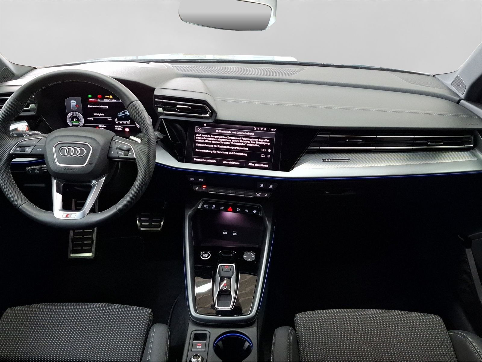 Highlights: Audi Connect je nach Dienst zeitlich begrenzt, danach kostenpflichtig verlängerbar - Hersteller-Anschlussgarantie 3 Jahre, max. 100.000 km Hersteller-Anschlussgarantie 3 Jahre, max. 100.000 km Ausstattungsvariante Advanced Garantie Audi Connect je nach Dienst zeitlich begrenzt - danach kostenpflichtig verlängerbar - Anschlussgarantie 3 Jahre max. 100.000 km Getriebe / Antrieb Automatik - Frontantrieb Pakete Ablage-/Gepäckraum Paket - Ambiente Licht Paket plus - Assistenz Paket Fahren und Parken plus - Assistenz Paket Schutz- und Warnsysteme plus - Business Paket - Klima Paket - Klimatisierungs Paket plus - Komfort Paket - Komfort Paket plus - Navigations Paket - Optik Paket Schwarz plus Airbags Fahrer-/Beifahrerairbag - Interaktionsairbag - Kopfairbag - Seitenairbag Sicherheit LED Scheinwerfer - Adaptiver Fahrassistent (AFA) - Ausweichassistent - Halteassistent - Querverkehrsassistent - Spurhalteassistent Lane Assist - Spurverlassenswarnung - Spurwechselassistent Audi side assist - Tagfahrlicht - Abbiegeassistent - Ablenkungserkennung - Akustisches Fahrzeug-Warnsystem - Antiblockiersystem ABS - Antischlupfregelung ASR - Audi connect Notruf & Service - Ausstiegswarnung - Beifahrerairbag Deaktivierung - dynamisches Blinklicht - Einparkhilfe vorn und hinten mit Parklenkassistent - Elektrisches Stabilitätsprogramm ESP - Elektronische Bremskraftverteilung EBV - Fernlichtassistent Light Assist - i-Size Kindersitzbefestigung hinten - ISOFIX Kindersitzbefestigung - ISOFIX Kindersitzbefestigung vorn - Kindersicherung elektrisch - Lichtsensor - Motor-Schleppmoment-Regelung MSR - Müdigkeitserkennung - Notbremsassistent - Notfall Assist - Notruf Service - Proaktiver Insassenschutz Front - Seite und Heck - Regensensor - Reifendruckkontrolle - Rückfahrkamera - top tether Kindersitzverankerung hinten - Verkehrszeichenerkennung - Wegfahrsperre Audio & Kommunikation Audi connect Navigation & Infotainment plus - MMI Navigation plus mit MMI touch - MMI Radio plus - Audi phone box mit Wireless Charging - Audi smartphone interface - Audi sound system - LTE-Unterstützung für Audi phone box - SONOS Premium Soundsystem - Audi connect Remote & Control - Digitaler Radioempfang DAB+ - MMI experience pro - zwei USB-Anschlüsse mit Ladefunktion im Fond - Vorbereitung für Functions on Demand Komfort Head-Up Display - Lendenwirbelstütze Fahrer-/Beifahrersitz elektrisch 4-Wege - Sitzheizung - Standheizung/-lüftung programmierbar - Gepäckraumklappe elektrisch öffnend und schließend - Komfortklimaautomatik 3-Zonen - Standklimatisierung - Audi drive select - Automatisch abblendender Innenspiegel rahmenlos - Automatische Distanzregelung ACC - Komfortschlüssel / Keyless Entry - Mittelarmlehne vorn - Servotronic - Verglasung hinten abgedunkelt Interieur Sitzbezüge in Stoff - Audi virtual cockpit plus - Dachhimmel in schwarz - Sportsitze - Einstiegsleisten Aluminium beleuchtet - Multifunktionslederlenkrad plus 3-Speichen mit Schaltwippen - Netztrennwand - Rücksitzlehne klappbar Exterieur Anhängerkupplung - Außenspiegel elektrisch verstell-/anklappbar beheizt automatisch abblendend - Außenspiegelgehäuse in Schwarz hochglänzend - Beifahrerspiegelabsenkung - Dachreling - Dachspoiler - LED Rückleuchten - Leichtmetallfelgen 18 Zoll Audi Sport 10-Speichen-Stern-Design - Start-Stop System Sonstiges e-tron Ladesystem kompakt - Haushaltsstecker Typ E/F für das e-tron Ladesystem - Industriestecker CEE 16A 400V lang und gerade für das e-tron Ladesystem - ECO-Funktion - Garagentoröffner - Metallic-Lackierung