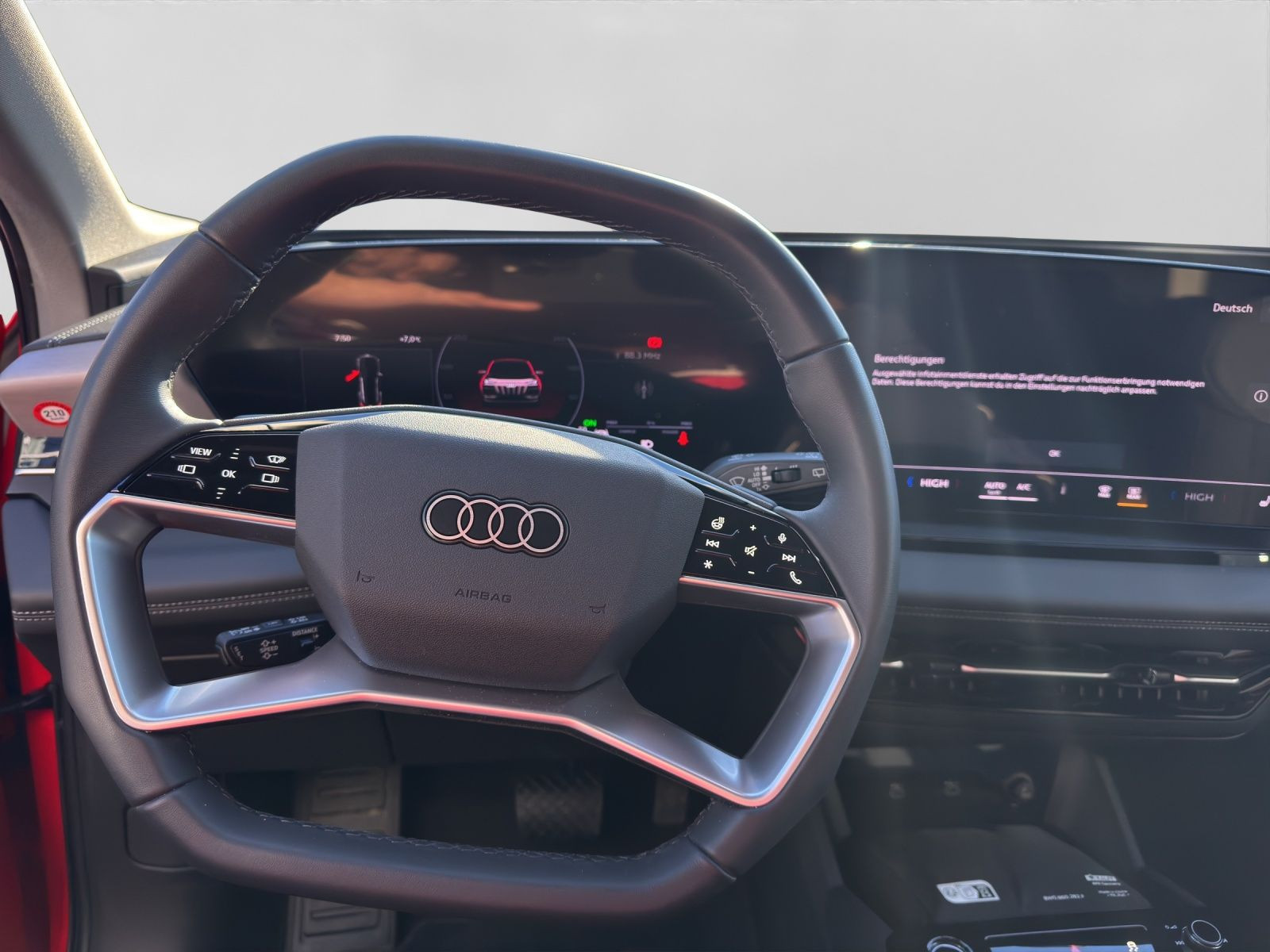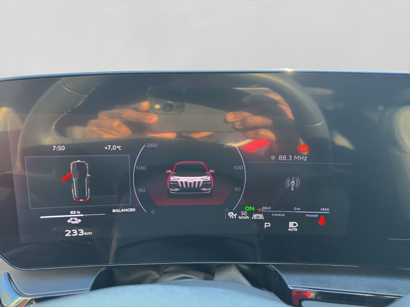 Hersteller-Anschlussgarantie 3 Jahre, max. 100.000 km; **Garantie**; Audi Connect je nach Dienst zeitlich begrenzt; danach kostenpflichtig verlängerbar; Anschlussgarantie 3 Jahre max. 100.000 km; **Batterie**; Hochvolt-Batterie 100 kWh (brutto) / 94,9 kWh (netto); **Getriebe / Antrieb**; quattro; **Pakete**; Ablage-/Gepäckraum Paket; Ambiente Licht Paket plus; Assistenz Paket Fahren und Parken plus; Assistenz Paket Schutz- und Warnsysteme plus; Exterieur Paket schwarz; Klimatisierungs Paket Winter; S line Exterieur Paket; S line Sport Paket; Tech pro; **Airbags**; Fahrer-/Beifahrerairbag; Interaktionsairbag; Kopfairbag vorn und hinten; Seitenairbag vorn und hinten; **Sicherheit**; 360 Grad Kamera - Area View; LED Scheinwerfer plus; Matrix LED Scheinwerfer; Adaptiver Fahrassistent plus; Adaptives Kurvenlicht; Assistenzfahrlicht; Ausweichassistent; Halteassistent; LED Tagfahrlicht mit Leaving und Coming Home Funktion; Spurverlassenswarnung; Spurwechselassistent Side Assist; Abbiegeassistent; Abbiegeassistent hinten; Antiblockiersystem ABS; Antischlupfregelung ASR; Audi connect Notruf & Service; Aufmerksamkeitserkennung; Ausstiegswarnung; Beifahrerairbag Deaktivierung; Einparkhilfe vorn und hinten; Elektrisches Stabilitätsprogramm ESP; Elektronische Bremskraftverteilung EBV; Fahrlichtautomatik; Insassenerkennung im Fond; Intelligent Light System; i-Size Kindersitzbefestigung vorn und hinten; Lichtsensor; Motor-Schleppmoment-Regelung MSR; Müdigkeitserkennung; Notbremsassistent; Notfall Assist; Proaktiver Insassenschutz Front; Seite und Heck; Querverkehrassistent; Querverkehrassistent hinten; Reifendruckkontrolle; top tether Kindersitzverankerung hinten; Verkehrszeichenbasierter Geschwindigkeitsbegrenzer; Verkehrszeichenerkennung; Wegfahrsperre; **Audio & Kommunikation**; Audi connect Navigation & Infotainment; Navigationssystem; Audi smartphone interface; Bang & Olufsen Premium Soundsystem mit 3D-Klang und Kopfstützenlautsprechern; LTE-Unterstützung für Audi phone box; MMI Beifahrerdisplay; Telefonablage mit induktiver Ladefunktion und Mobilfunk-Koppelantenne; Audi connect Remote & Control; Digitaler Radioempfang DAB+; MMI Experience pro; USB-Schnittstellen mit erhöhter Ladeleistung; **Komfort**; Augmented-Reality Head-Up Display; Fahrer-/Beifahrersitz elektrisch; Lendenwirbelstütze Fahrer-/Beifahrersitz elektrisch 4-Wege; Memoryfunktion Fahrersitz; Sitzheizung vorn und hinten; Standheizung/-lüftung programmierbar; Adaptives Luftfederfahrwerk; Gepäckraumklappe elektrisch öffnend und schließend; Komfortklimaautomatik 3-Zonen; Standklimatisierung; Akustikverglasung; Audi drive select; Automatisch abblendender Innenspiegel; Automatische Distanzregelung ACC; Digitaler Schlüssel; Elektrische Luftzusatzheizung; Fensterheber elektrisch vorn und hinten; Komfortmittelarmlehne vorn; Komfortschlüssel / Keyless Entry; Lenkradeinstellung elektrisch; Verglasung hinten abgedunkelt; Zentralverriegelung mit Fernbedienung; **Interieur**; Sitzbezüge in Leder; Audi virtual cockpit plus; Sportsitze; Lenkradheizung; Multifunktionssportlederlenkrad oben und unten abgeflacht mit Schaltwippen; Rücksitzbank ungeteilt Lehne geteilt umlegbar (dreiteilig) mit Mittelarmlehne; **Exterieur**; Anhängerkupplung anklappbar; Audi Matrix OLED-Rückleuchten; Außenspiegel elektrisch verstell-/anklappbar beheizt automatisch abblendend; Außenspiegelgehäuse in Schwarz hochglänzend; Außenspiegel mit Memory; Beifahrerspiegelabsenkung; Dachreling schwarz; e-tron Sportsound; Leichtmetallfelgen 21 Zoll Audi Sport 5-Y-Speichen-Dynamik-Design - 9x21 255/45 v - 10x21 285/40 h; Projektionsleuchte in den Außenspiegeln; Scheinwerferreinigungsanlage SRA; **Sonstiges**; CCS Ladedose; e-tron Ladesystem kompakt; Haushaltsstecker Typ E/F für das e-tron Ladesystem; Wandhalterung Clip; Wärmepumpe; zweiter AC-Ladezugang (Beifahrerseite); Garagentoröffner; Sitzbelegungserkennung für den Beifahrerairbag; Metallic-Lackierung