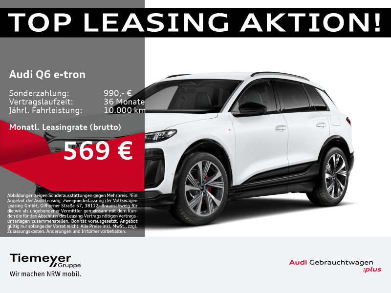 Hersteller-Anschlussgarantie 3 Jahre, max. 100.000 km; **Garantie**; Audi Connect je nach Dienst zeitlich begrenzt; danach kostenpflichtig verlängerbar; Anschlussgarantie 3 Jahre max. 100.000 km; **Batterie**; Hochvolt-Batterie 83 kWh (brutto) / 75,8 kWh (netto); **Getriebe / Antrieb**; Heckantrieb; **Pakete**; Ablage-/Gepäckraum Paket; Ambiente Licht Paket plus; Assistenz Paket Fahren und Parken plus; Assistenz Paket Schutz- und Warnsysteme plus; Exterieur Paket schwarz; Klimatisierungs Paket Winter; Komfort Paket; S line Exterieur Paket; S line Sport Paket; Tech pro; **Airbags**; Fahrer-/Beifahrerairbag; Interaktionsairbag; Kopfairbag vorn und hinten; Seitenairbag vorn und hinten; **Sicherheit**; 360 Grad Kamera - Area View; Matrix LED Scheinwerfer; Adaptiver Fahrassistent plus; Adaptives Kurvenlicht; Assistenzfahrlicht; Ausweichassistent; e-Sound; Halteassistent; LED Tagfahrlicht mit Leaving und Coming Home Funktion; Spurverlassenswarnung; Spurwechselassistent Side Assist; Abbiegeassistent; Abbiegeassistent hinten; Antiblockiersystem ABS; Antischlupfregelung ASR; Audi connect Notruf & Service; Aufmerksamkeitserkennung; Ausstiegswarnung; Beifahrerairbag Deaktivierung; Diebstahlwarnanlage; Einparkhilfe vorn und hinten; Elektrisches Stabilitätsprogramm ESP; Elektronische Bremskraftverteilung EBV; Fahrlichtautomatik; Insassenerkennung im Fond; Intelligent Light System; i-Size Kindersitzbefestigung vorn und hinten; Lichtsensor; Motor-Schleppmoment-Regelung MSR; Müdigkeitserkennung; Notbremsassistent; Notfall Assist; Proaktiver Insassenschutz Front; Seite und Heck; Querverkehrassistent; Querverkehrassistent hinten; Reifendruckkontrolle; top tether Kindersitzverankerung hinten; Verkehrszeichenbasierter Geschwindigkeitsbegrenzer; Verkehrszeichenerkennung; **Audio & Kommunikation**; Audi connect Navigation & Infotainment; Navigationssystem; Audi smartphone interface; Bang & Olufsen Premium Soundsystem mit 3D-Klang und Kopfstützenlautsprechern; MMI Beifahrerdisplay; Telefonablage mit induktiver Ladefunktion und Mobilfunk-Koppelantenne; Audi connect Remote & Control; Digitaler Radioempfang DAB+; MMI Experience pro; USB-Schnittstellen mit erhöhter Ladeleistung; **Komfort**; Augmented-Reality Head-Up Display; Fahrer-/Beifahrersitz elektrisch; Lendenwirbelstütze Fahrer-/Beifahrersitz elektrisch 4-Wege; Memoryfunktion Fahrersitz; Sitzheizung vorn und hinten; Standheizung/-lüftung programmierbar; Adaptives Luftfederfahrwerk; Gepäckraumklappe elektrisch öffnend und schließend; Komfortklimaautomatik 3-Zonen; Standklimatisierung; Akustikverglasung; Audi drive select; Automatisch abblendender Innenspiegel; Automatische Distanzregelung ACC; Bordsteinautomatik; Digitaler Schlüssel; Elektrische Luftzusatzheizung; Komfortmittelarmlehne vorn; Komfortschlüssel / Keyless Entry mit Safe-Sicherung; Lenkradeinstellung elektrisch; Verglasung hinten abgedunkelt; Zentralverriegelung mit Fernbedienung; **Interieur**; Sitzbezüge in Leder; Audi virtual cockpit plus; Sportsitze; Einstiegleisten mit beleuchteter Aluminiumeinlage; Lenkradheizung; Multifunktionslederlenkrad mit Schaltwippen; Rücksitzbank ungeteilt Lehne geteilt umlegbar (dreiteilig) mit Mittelarmlehne; **Exterieur**; Anhängerkupplung anklappbar; Audi Matrix OLED-Rückleuchten; Außenspiegel elektrisch verstell-/anklappbar beheizt automatisch abblendend; Außenspiegelgehäuse in Schwarz hochglänzend; Außenspiegel mit Memory; Beifahrerspiegelabsenkung; Dachreling schwarz; e-tron Sportsound; Leichtmetallfelgen 21 Zoll 5-V-Speichen-Struktur-Design - 9x21 vorne - 10x21 hinten; Projektionsleuchte in den Außenspiegeln; Scheinwerferreinigungsanlage SRA; **Sonstiges**; CCS Ladedose; e-tron Ladesystem kompakt; Haushaltsstecker Typ E/F für das e-tron Ladesystem; Ladekabel für öffentliche Ladesäulen; Netzkabel mit Industriestecker CEE einphasig 230V/16A; Wandhalterung Clip; Wärmepumpe; zweiter AC-Ladezugang (Beifahrerseite); Bremssättel in rot; Garagentoröffner; Sitzbelegungserkennung für den Beifahrerairbag; Metallic-Lackierung; * ehemalige UPE des Herstellers: 89.680; * 00 ? inkl. Ust
