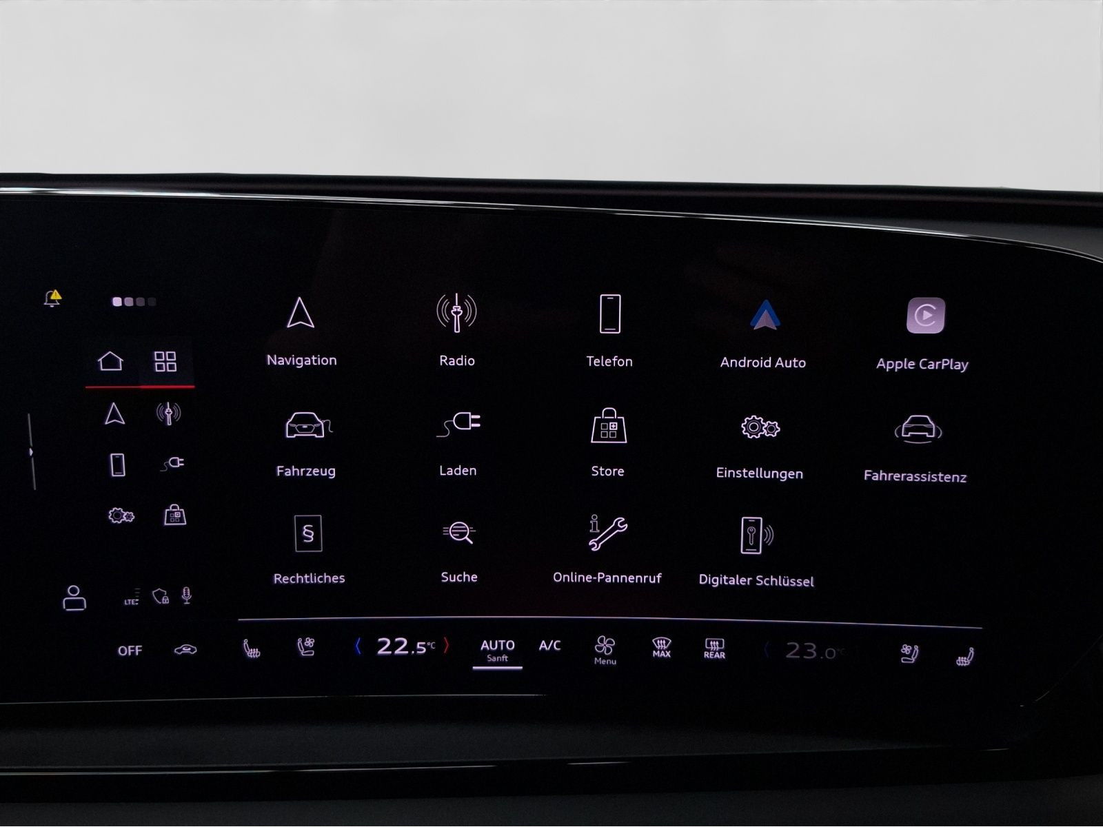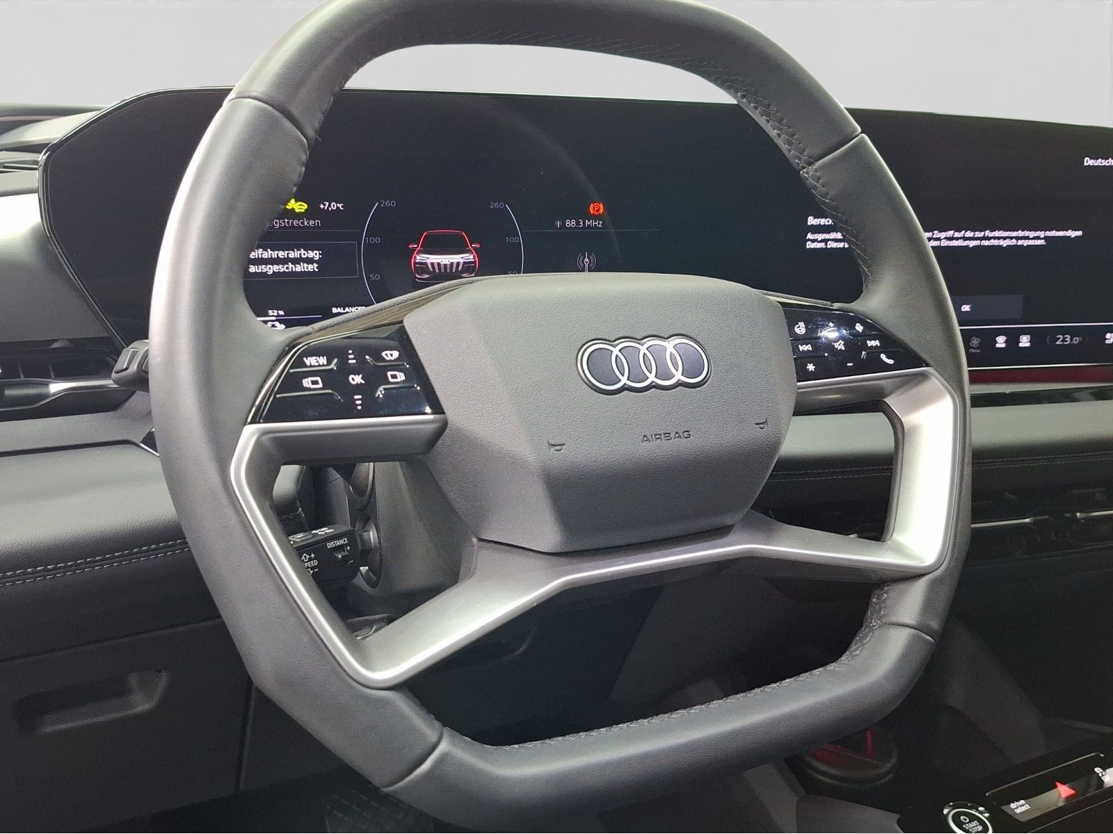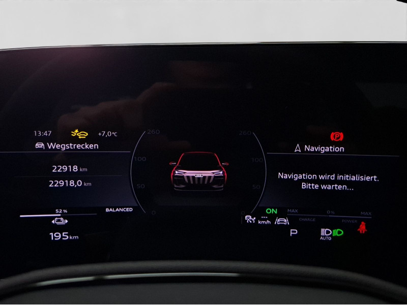 Hersteller-Anschlussgarantie 3 Jahre, max. 100.000 km; **Ausstattungsvariante**; Advanced; **Garantie**; Audi Connect je nach Dienst zeitlich begrenzt; danach kostenpflichtig verlängerbar; Anschlussgarantie 3 Jahre max. 100.000 km; **Batterie**; Hochvolt-Batterie 100 kWh (brutto) / 94,9 kWh (netto); **Getriebe / Antrieb**; Heckantrieb; **Pakete**; Ablage-/Gepäckraum Paket; Ambiente Licht Paket plus; Assistenz Paket Fahren und Parken; Assistenz Paket Parken; Assistenz Paket Schutz- und Warnsysteme plus; Klimatisierungs Paket Winter; Komfort Paket II; Tech plus Paket; **Airbags**; Fahrer-/Beifahrerairbag; Interaktionsairbag; Kopfairbag vorn und hinten; Seitenairbag vorn und hinten; **Sicherheit**; 360 Grad Kamera - Area View; LED Scheinwerfer plus; Matrix LED Scheinwerfer; Adaptives Kurvenlicht; Assistenzfahrlicht; Ausweichassistent; Halteassistent; Spurverlassenswarnung; Spurwechselassistent Side Assist; Tagfahrlicht mit Leaving und Coming Home Funktion; Abbiegeassistent; Abbiegeassistent hinten; Antiblockiersystem ABS; Antischlupfregelung ASR; Audi connect Notruf & Service; Aufmerksamkeitserkennung; Ausstiegswarnung; Beifahrerairbag Deaktivierung; Diebstahlwarnanlage; Einparkhilfe vorn und hinten mit Parklenkassistent; Elektrisches Stabilitätsprogramm ESP; Elektronische Bremskraftverteilung EBV; Fahrlichtautomatik; Fernlichtassistent; Insassenerkennung im Fond; Intelligent Light System; i-Size Kindersitzbefestigung vorn und hinten; Lichtsensor; Motor-Schleppmoment-Regelung MSR; Müdigkeitserkennung; Notbremsassistent; Notfall Assist; Proaktiver Insassenschutz Front; Seite und Heck; Querverkehrassistent; Querverkehrassistent hinten; Reifendruckkontrolle; top tether Kindersitzverankerung hinten; Verkehrszeichenbasierter Geschwindigkeitsbegrenzer; Verkehrszeichenerkennung; **Audio & Kommunikation**; Audi connect Navigation & Infotainment; Navigationssystem; Audi smartphone interface; Bang & Olufsen Premium Sound System mit 3D Klang; LTE-Unterstützung für Audi phone box; MMI Beifahrerdisplay; Telefonablage mit induktiver Ladefunktion und Mobilfunk-Koppelantenne; Audi connect Remote & Control; Digitaler Radioempfang DAB+; MMI Experience pro; USB-Schnittstellen mit erhöhter Ladeleistung; **Komfort**; Augmented-Reality Head-Up Display; Fahrer-/Beifahrersitz elektrisch; Lendenwirbelstütze Fahrer-/Beifahrersitz elektrisch 4-Wege; Memoryfunktion Fahrersitz; Sitzbelüftung; Sitzheizung vorn und hinten; Standheizung/-lüftung programmierbar; Gepäckraumklappe elektrisch öffnend und schließend; Komfortklimaautomatik 3-Zonen; Standklimatisierung; Akustikverglasung; Audi drive select; Automatisch abblendender Innenspiegel; Automatische Distanzregelung ACC; Digitaler Schlüssel; Elektrische Luftzusatzheizung; Fensterheber elektrisch; Komfortmittelarmlehne vorn; Komfortschlüssel / Keyless Entry mit Safe-Sicherung; Sonnenschutzrollo; Verglasung hinten abgedunkelt; Zentralverriegelung mit Fernbedienung; **Interieur**; Sitzbezüge in Leder; Audi virtual cockpit plus; Sportsitze; Lenkradheizung; Multifunktionssportlederlenkrad oben und unten abgeflacht mit Schaltwippen; Rücksitzbank ungeteilt Lehne geteilt umlegbar (dreiteilig) mit Mittelarmlehne; **Exterieur**; Anhängerkupplung anklappbar; S-Sportfahrwerk; Außenspiegel elektrisch verstell-/anklappbar beheizt automatisch abblendend; Außenspiegel mit Memory; Beifahrerspiegelabsenkung; Dachreling schwarz; e-tron Sportsound; LED-Heckleuchten pro; Leichtmetallfelgen 21 Zoll Audi Sport 5-Y-Speichen-Dynamik-Design - 9x21 255/45 v - 10x21 285/40 h; Projektionsleuchte in den Außenspiegeln; Scheinwerferreinigungsanlage SRA; **Sonstiges**; CCS Ladedose; e-tron Ladesystem kompakt; Haushaltsstecker Typ E/F für das e-tron Ladesystem; Wandhalterung Clip; Wärmepumpe; zweiter AC-Ladezugang (Beifahrerseite); Bremssättel in rot; Sitzbelegungserkennung für den Beifahrerairbag; Metallic-Lackierung; * e-tron Sportsound; * Tech plus