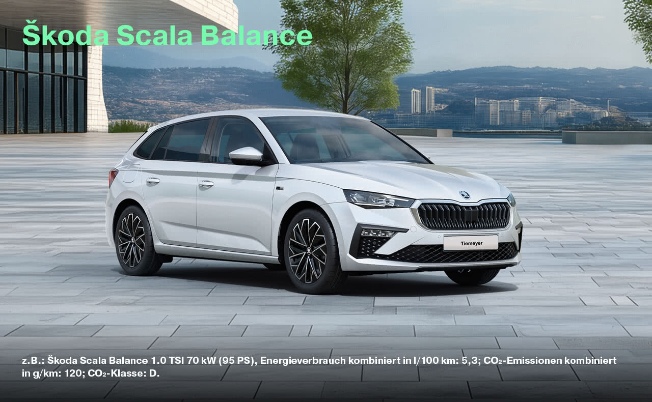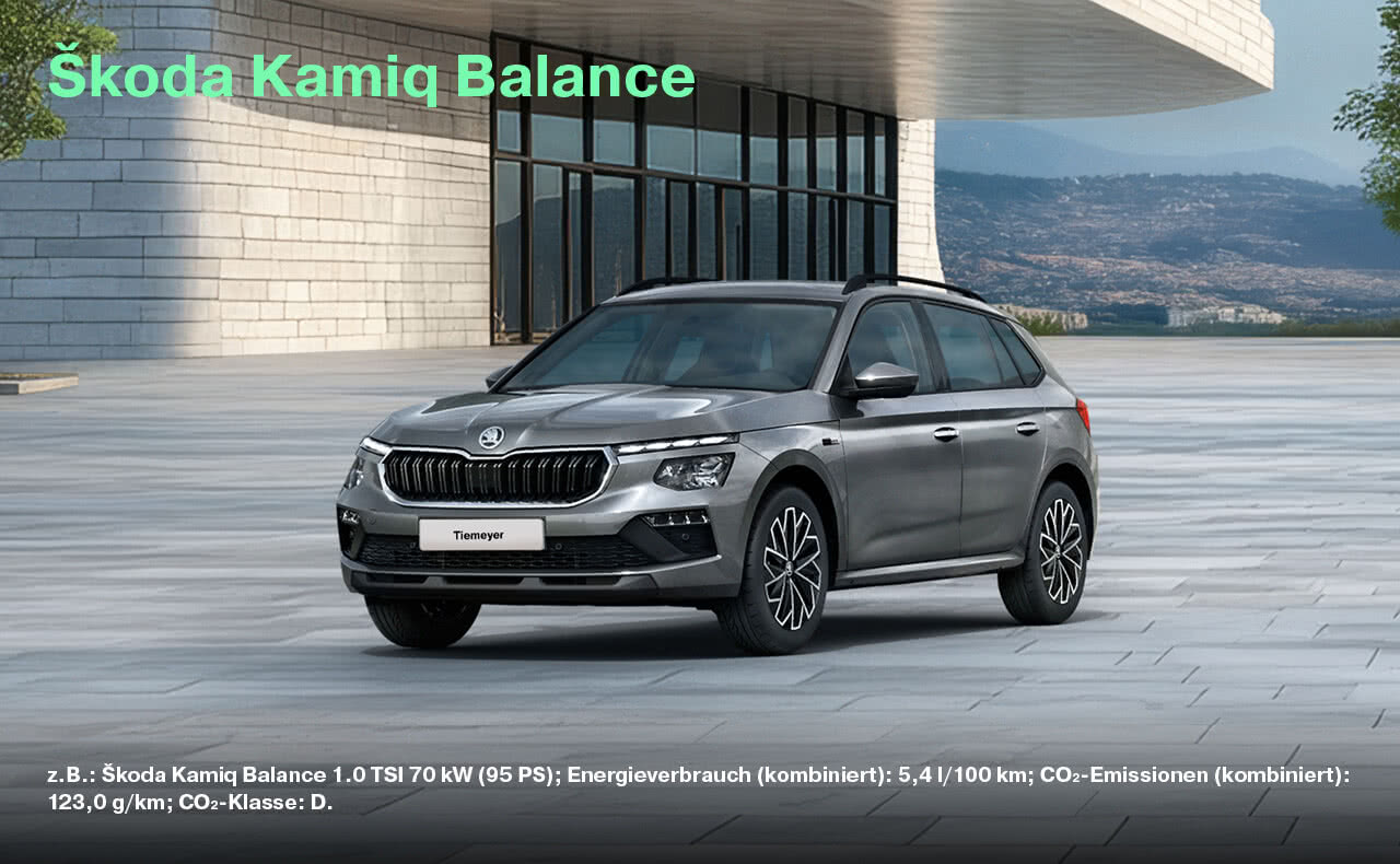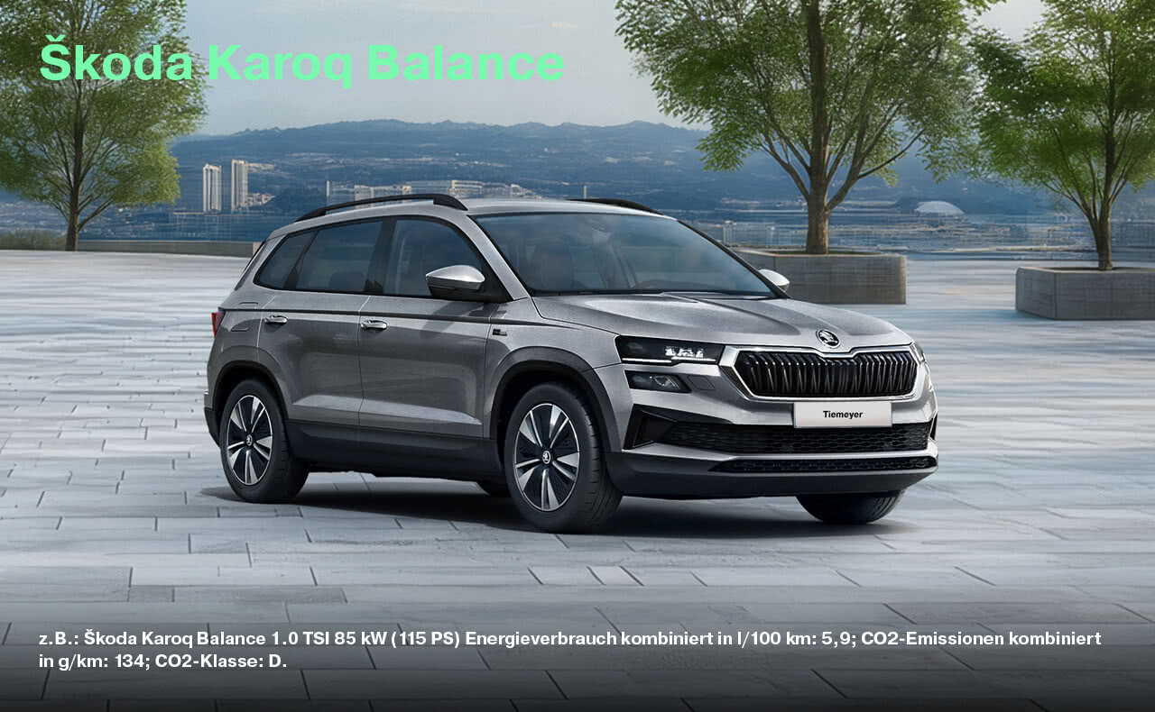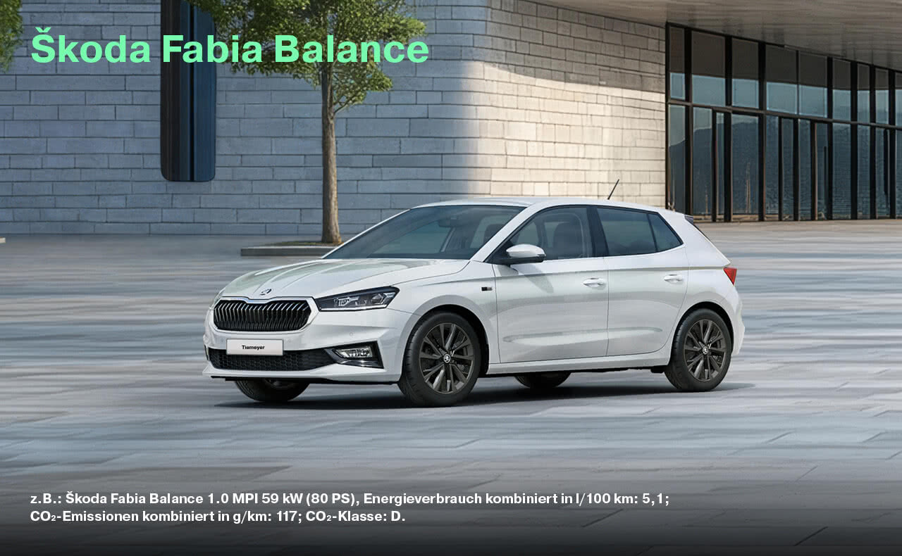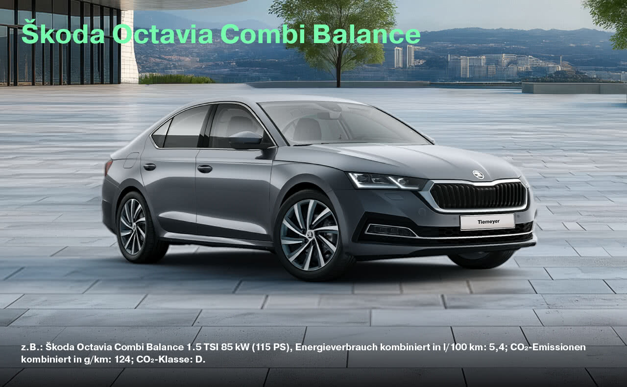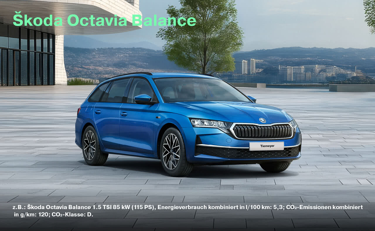 z.B.: Škoda Octavia Balance 1.5 TSI 85 kW (115 PS), Energieverbrauch kombiniert in l/100 km: 5,3; CO₂-Emissionen kombiniert in g/km: 120; CO₂-Klasse: D. Škoda Octavia Combi Balance 1.5 TSI 85 kW (115 PS), Energieverbrauch kombiniert in l/100 km: 5,4; CO₂-Emissionen kombiniert in g/km: 124; CO₂-Klasse: D. Škoda Scala Balance 1.0 TSI 70 kW (95 PS), Energieverbrauch kombiniert in l/100 km: 5,3; CO₂-Emissionen kombiniert in g/km: 120; CO₂-Klasse: D. Škoda Fabia Balance 1.0 MPI 59 kW (80 PS), Energieverbrauch kombiniert in l/100 km: 5,1; CO₂-Emissionen kombiniert in g/km: 117; CO₂-Klasse: D. Škoda Kamiq Balance 1.0 TSI 70 kW (95 PS); Energieverbrauch (kombiniert): 5,4 l/100 km; CO₂-Emissionen (kombiniert): 123,0 g/km; CO₂-Klasse: D. Škoda Karoq Balance 1.0 TSI 85 kW (115 PS) Energieverbrauch kombiniert in l/100 km: 5,9; CO2-Emissionen kombiniert in g/km: 134; CO2-Klasse: D.
